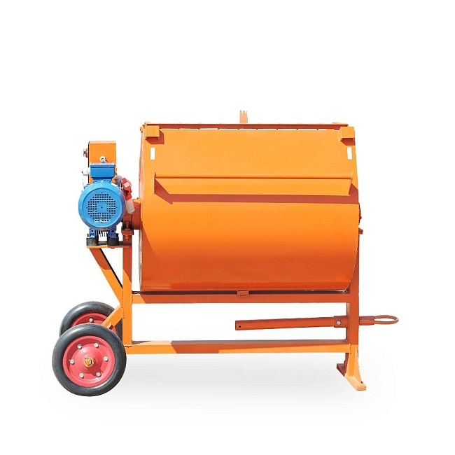 Принцип работы заключается в перемешивании компонентов с помощью 4-х резиновых лопастей, находящихся на горизонтальном валу, расположенном внутри барабана. При приготовлении строительных растворов, вначале в растворомешалку заливается вода, затем заполнитель, вяжущие смеси и пластификаторы. Время замеса, в зависимости от используемых материалов 105-120 с. После разгрузки готового раствора, сразу готов к новому циклу работы.